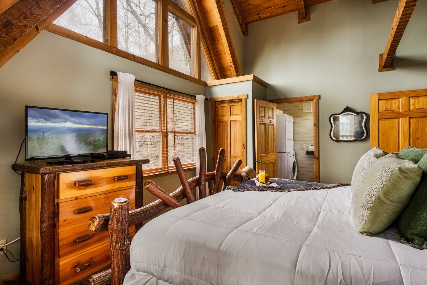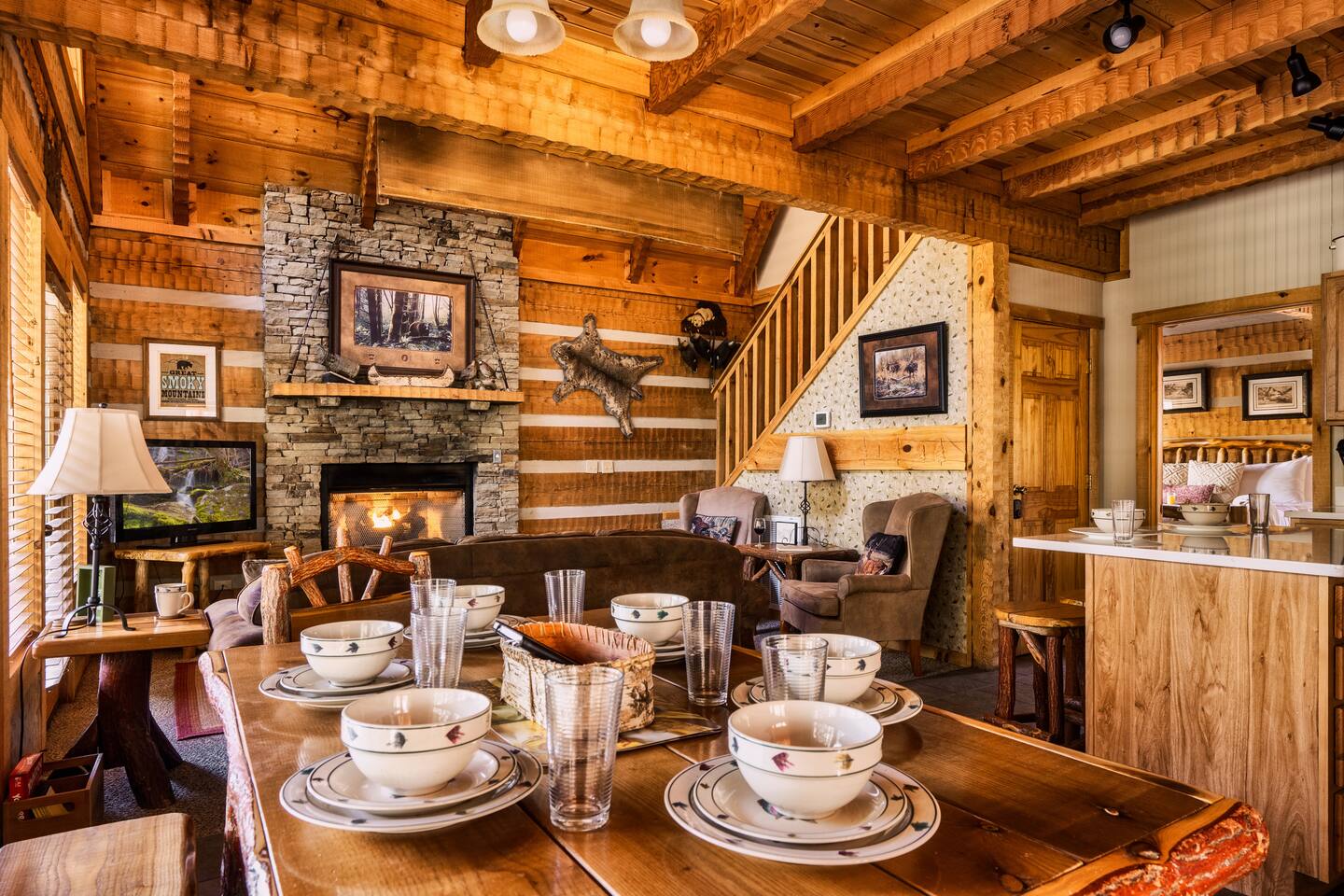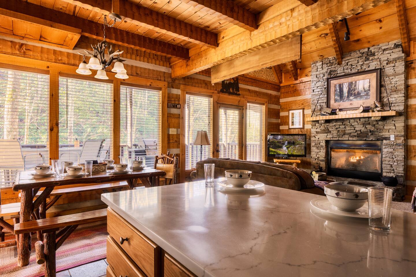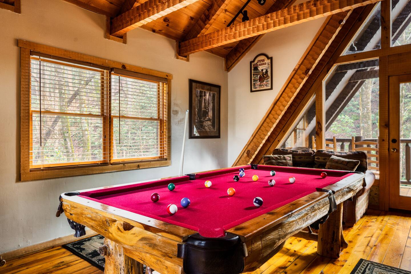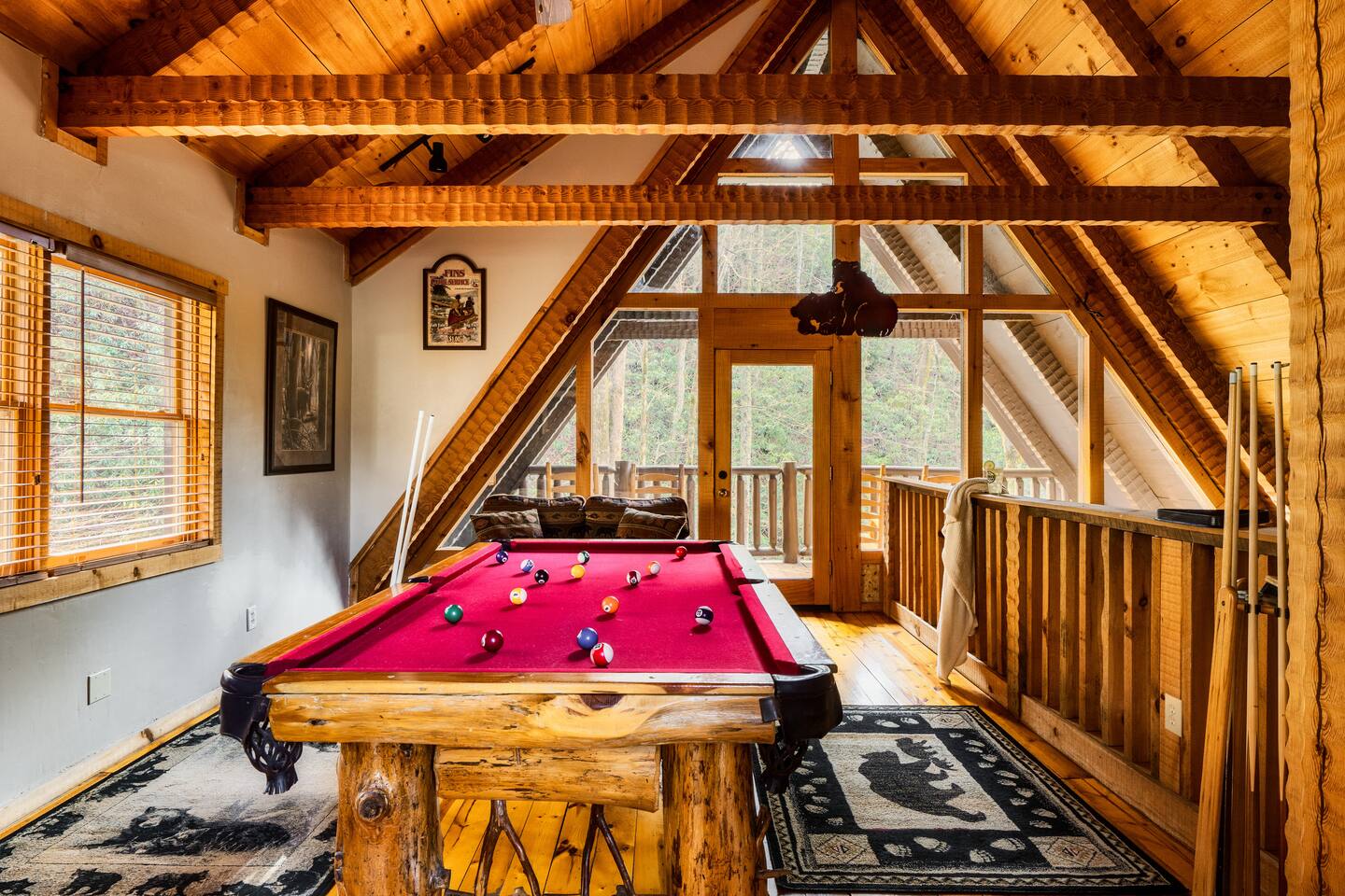 The main living area is open and includes living area with a gas fireplace, dining area and kitchen. The sofa is a queen-size sleeper with memory-foam mattress. The downstairs bedroom has a king-size bed, jacuzzi and bathroom with shower. The upstairs loft has a pool table and opens to an upper deck with rocking chairs. The upstairs bedroom has another king-size bed and en suite bathroom with washer and dryer. The hot-tub is on a lower deck over-looking the creek. This cabin also features a screened porch and sunroom.
