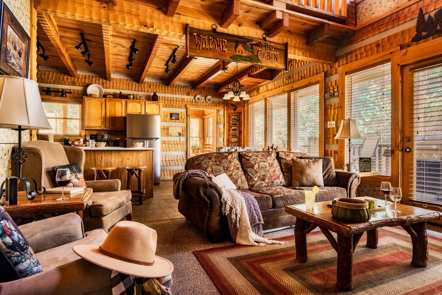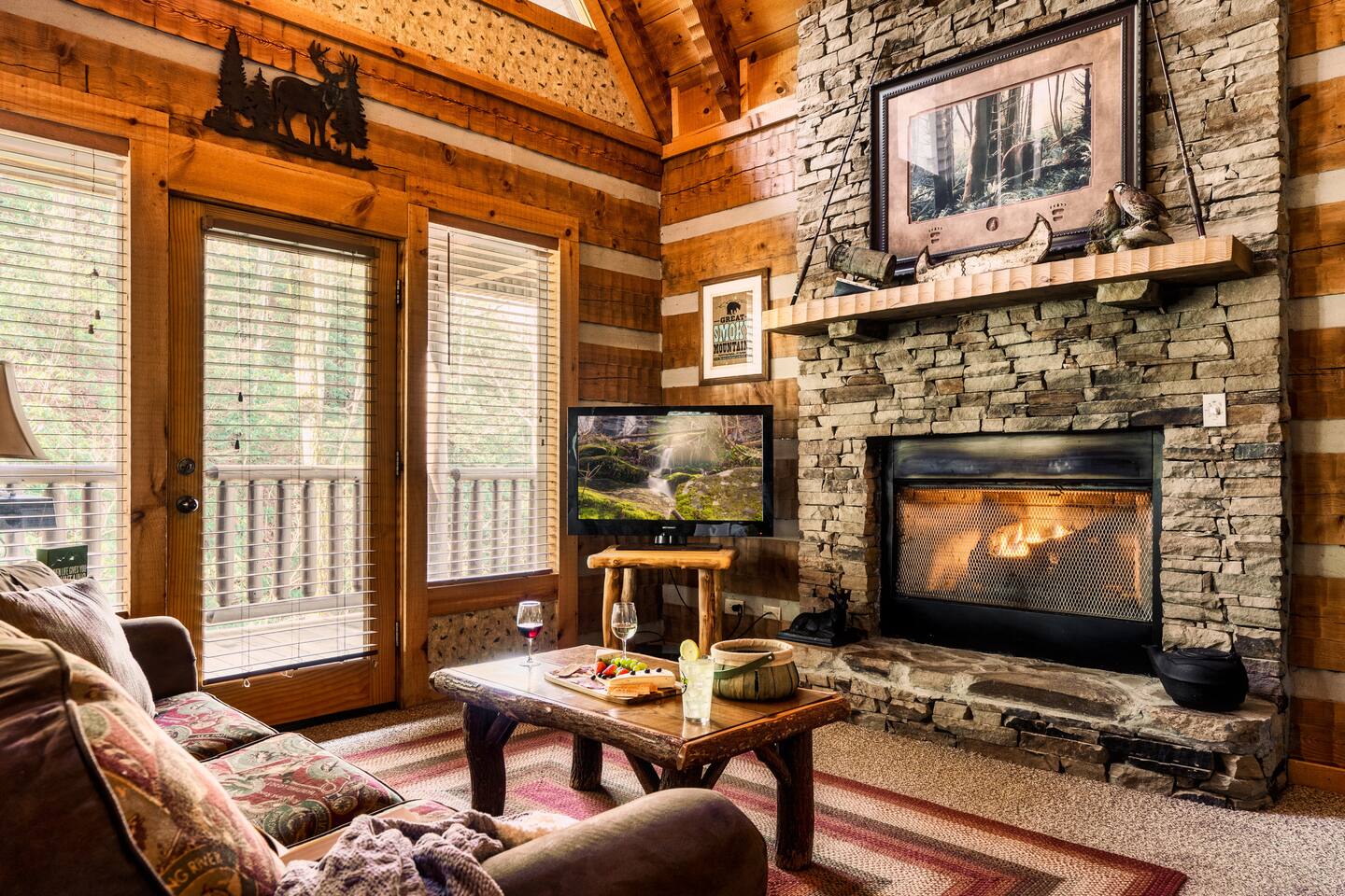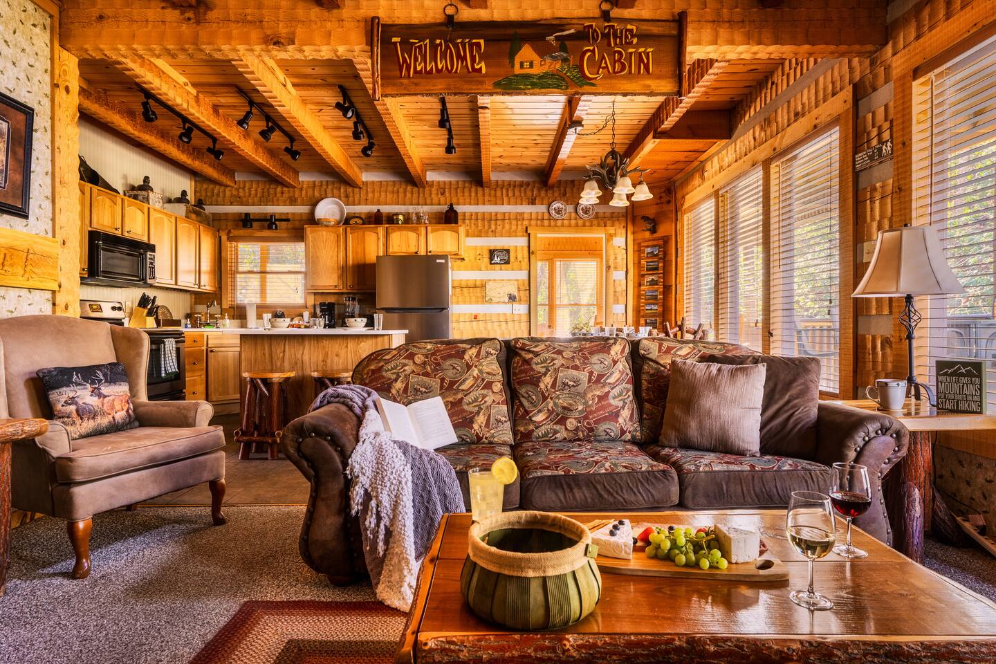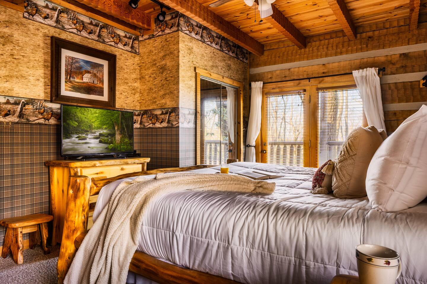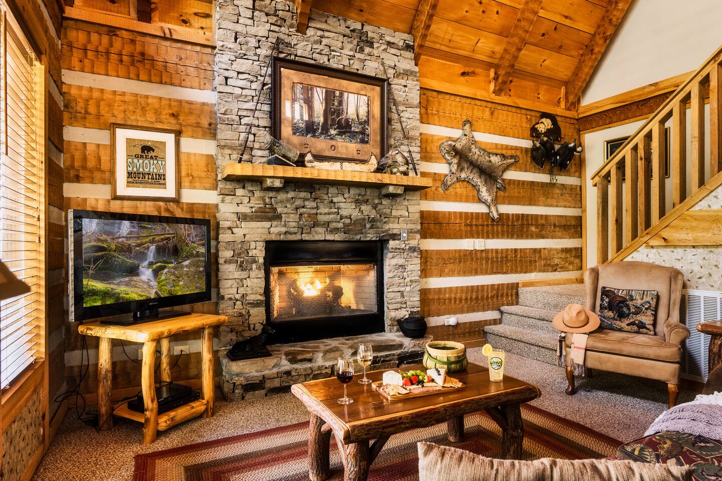 The main living area is open and includes living area with a gas fireplace, dining area and kitchen. The sofa is a queen-size sleeper with memory-foam mattress. The downstairs bedroom has a king-size bed, jacuzzi and bathroom with shower. The upstairs loft has a pool table and opens to an upper deck with rocking chairs. The upstairs bedroom has another king-size bed and en suite bathroom with washer and dryer. The hot-tub is on a lower deck over-looking the creek. This cabin also features a screened porch and sunroom.