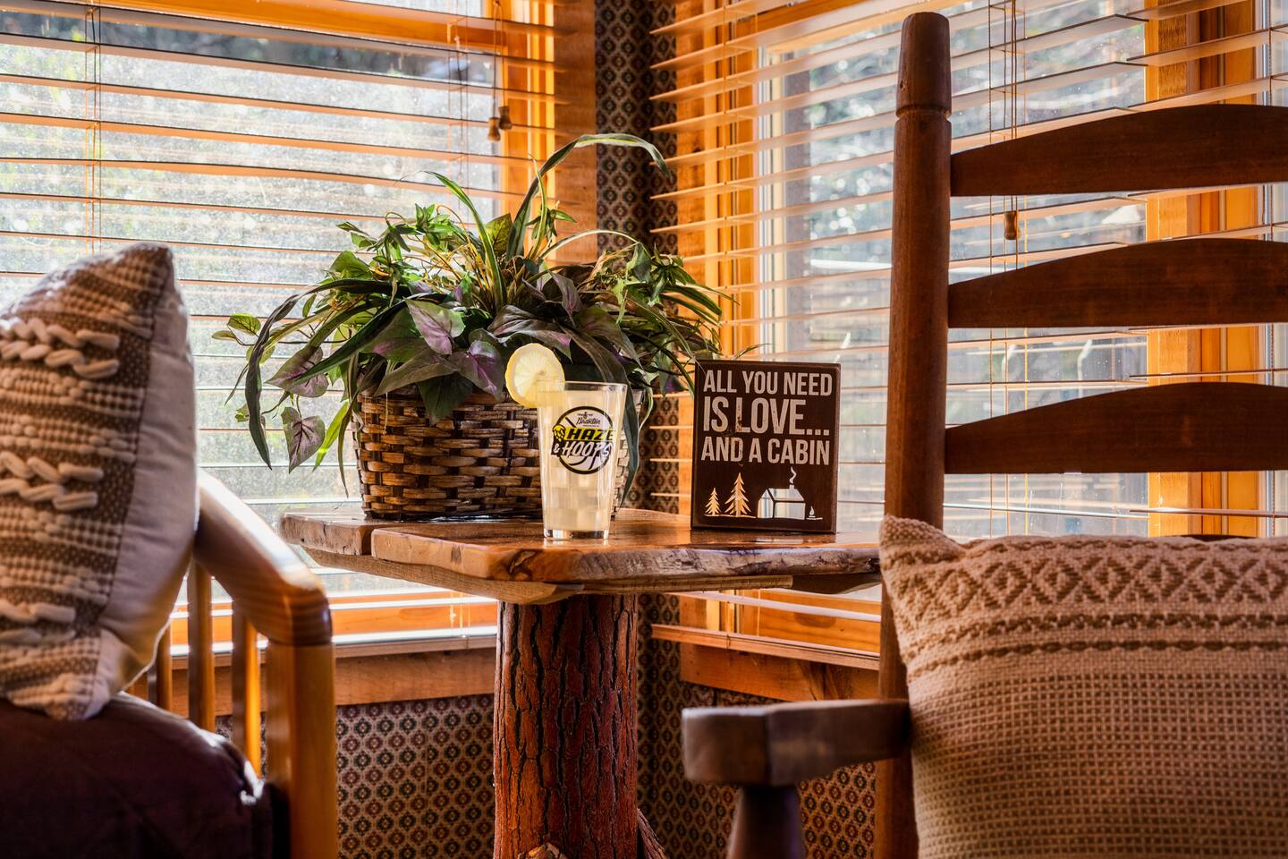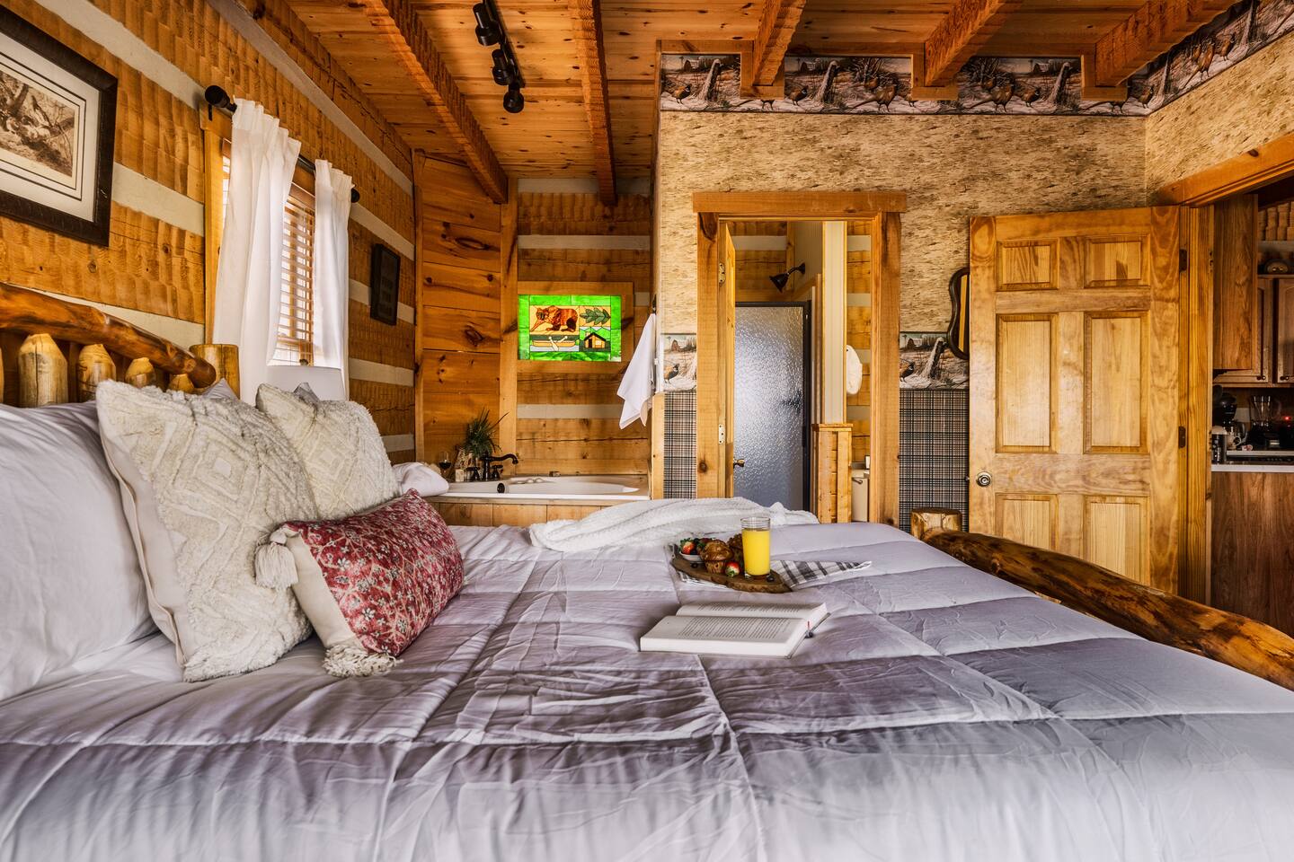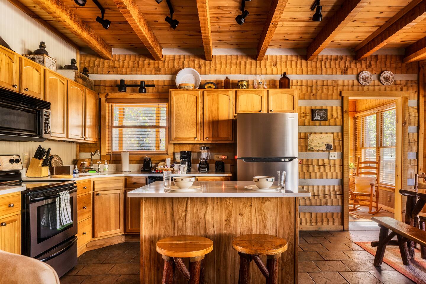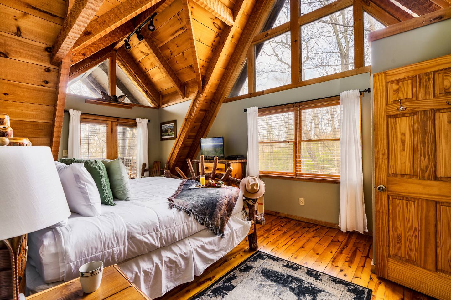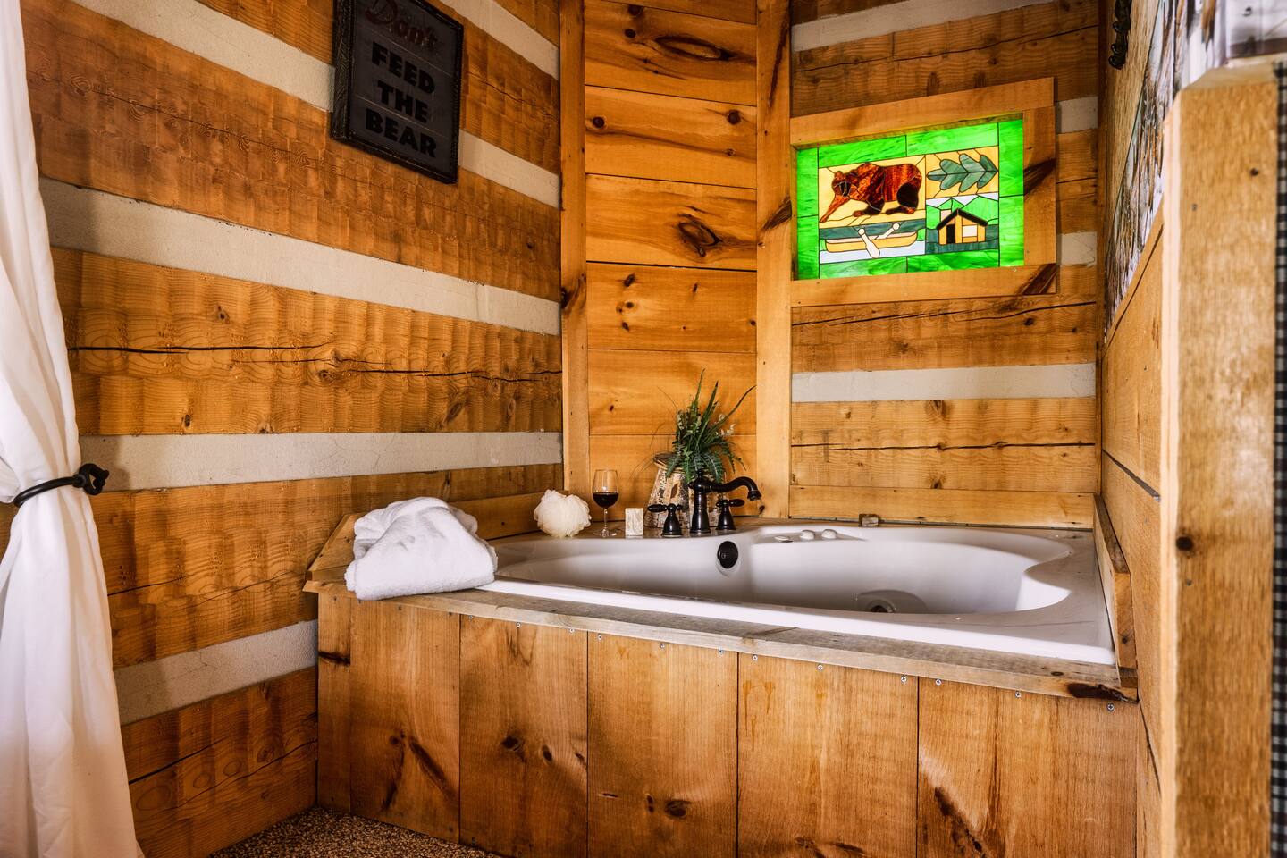The main living area is open and includes living area with a gas fireplace, dining area and kitchen. The sofa is a queen-size sleeper with memory-foam mattress. The downstairs bedroom has a king-size bed, jacuzzi and bathroom with shower. The upstairs loft has a pool table and opens to an upper deck with rocking chairs. The upstairs bedroom has another king-size bed and en suite bathroom with washer and dryer. The hot-tub is on a lower deck over-looking the creek. This cabin also features a screened porch and sunroom.