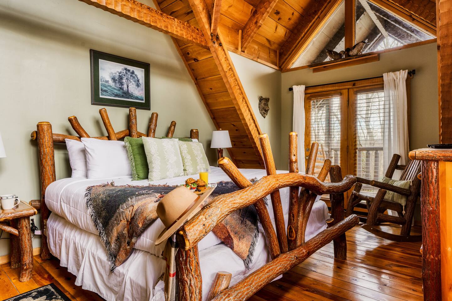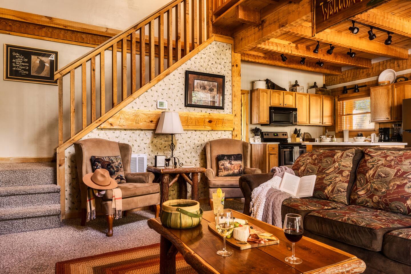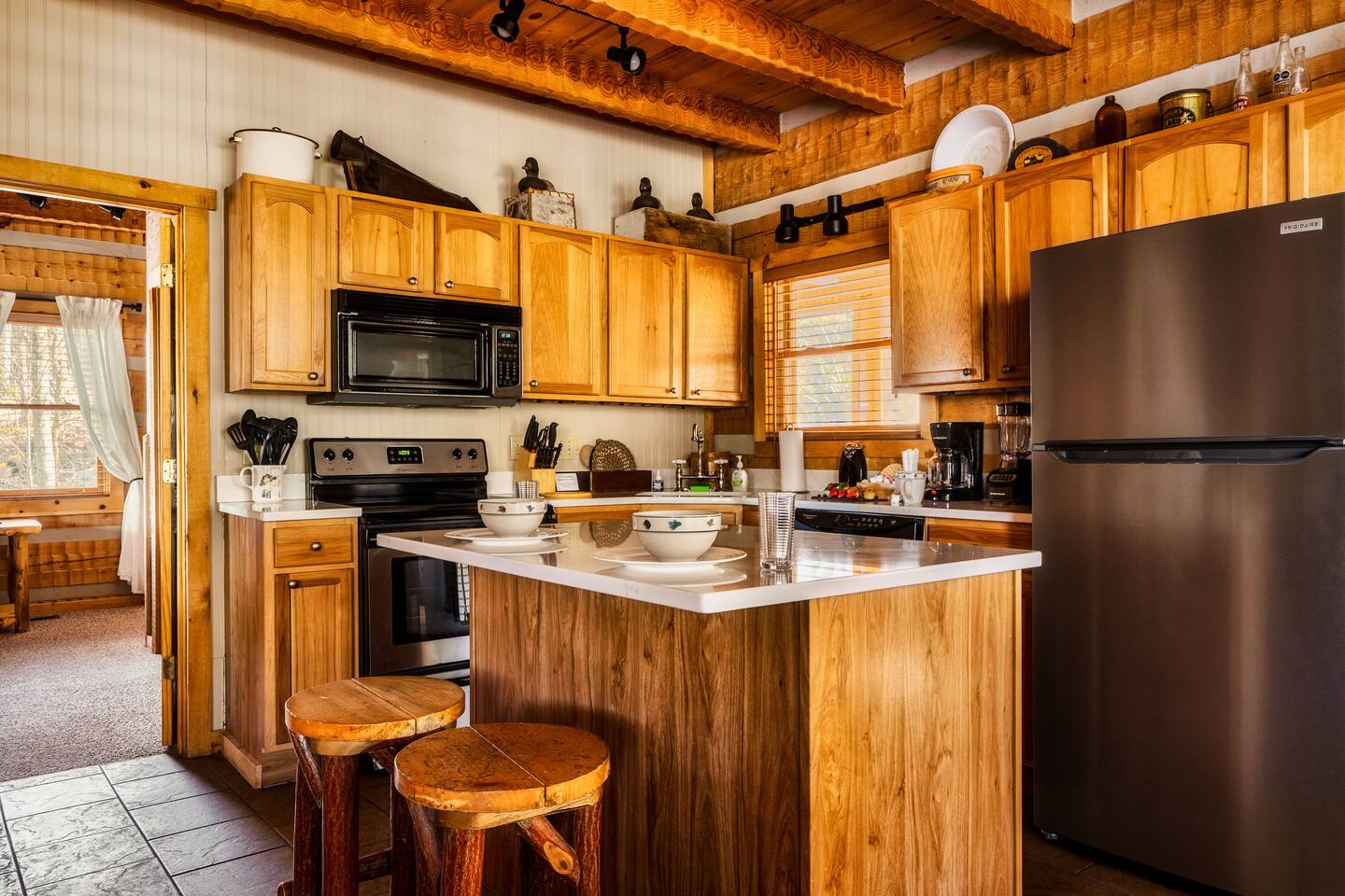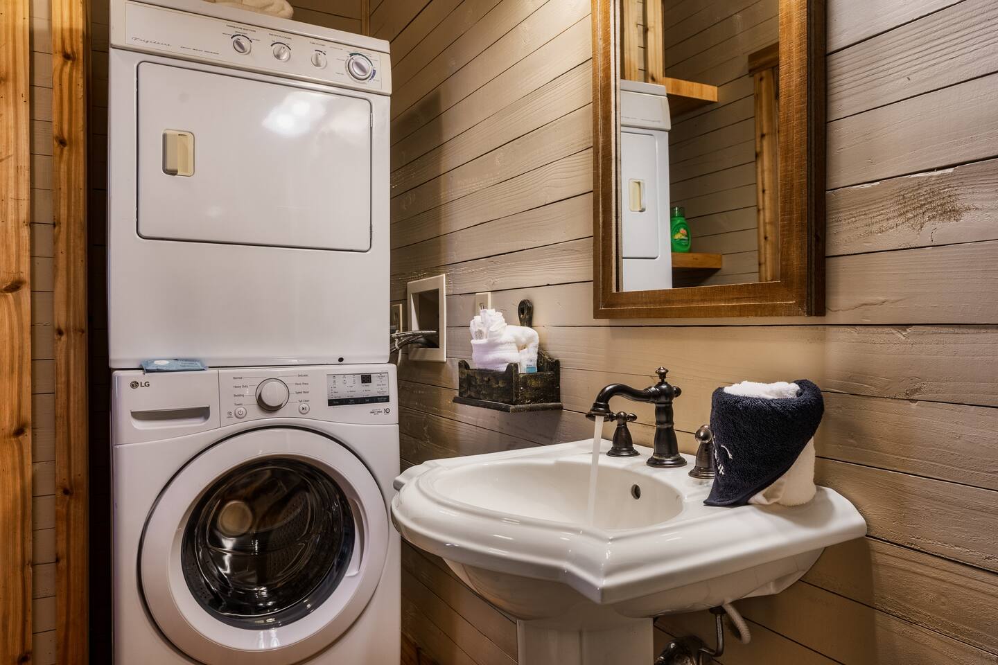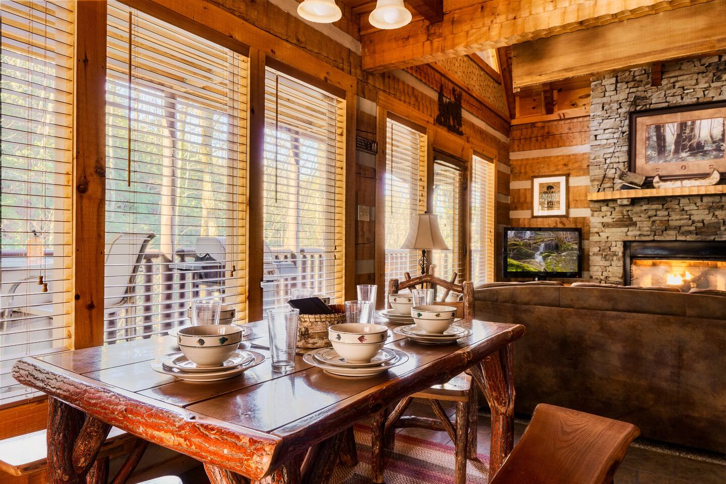 The main living area is open and includes living area with a gas fireplace, dining area and kitchen. The sofa is a queen-size sleeper with memory-foam mattress. The downstairs bedroom has a king-size bed, jacuzzi and bathroom with shower. The upstairs loft has a pool table and opens to an upper deck with rocking chairs. The upstairs bedroom has another king-size bed and en suite bathroom with washer and dryer. The hot-tub is on a lower deck over-looking the creek. This cabin also features a screened porch and sunroom.