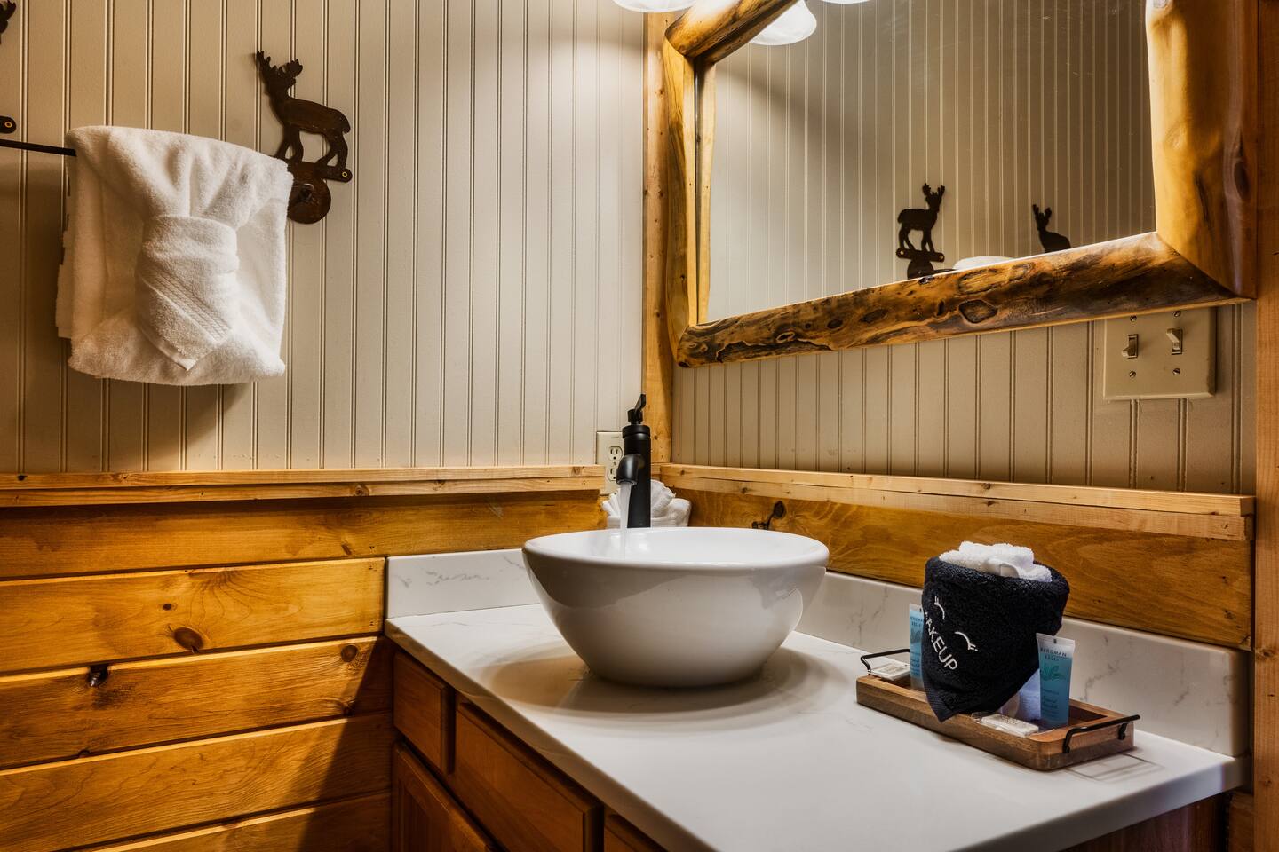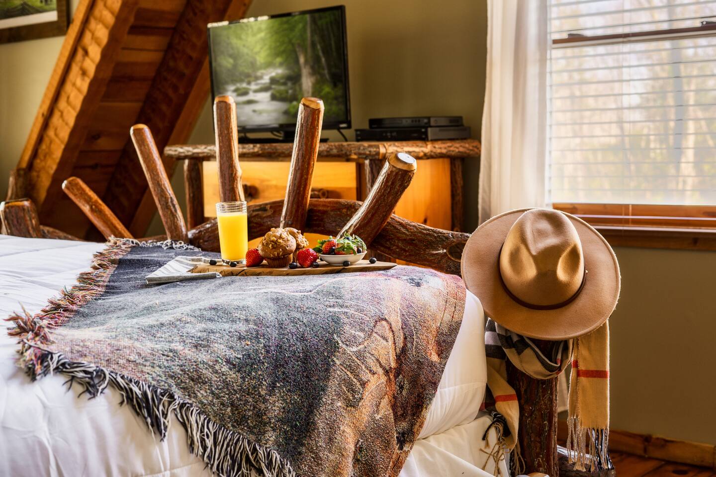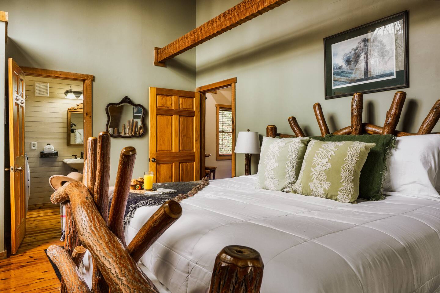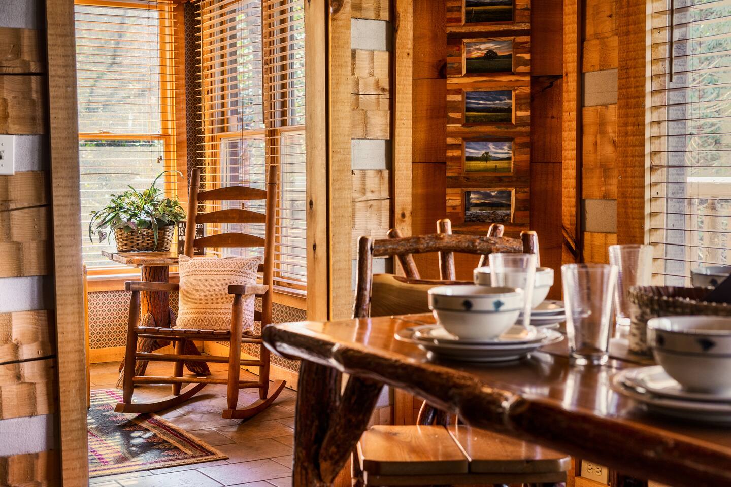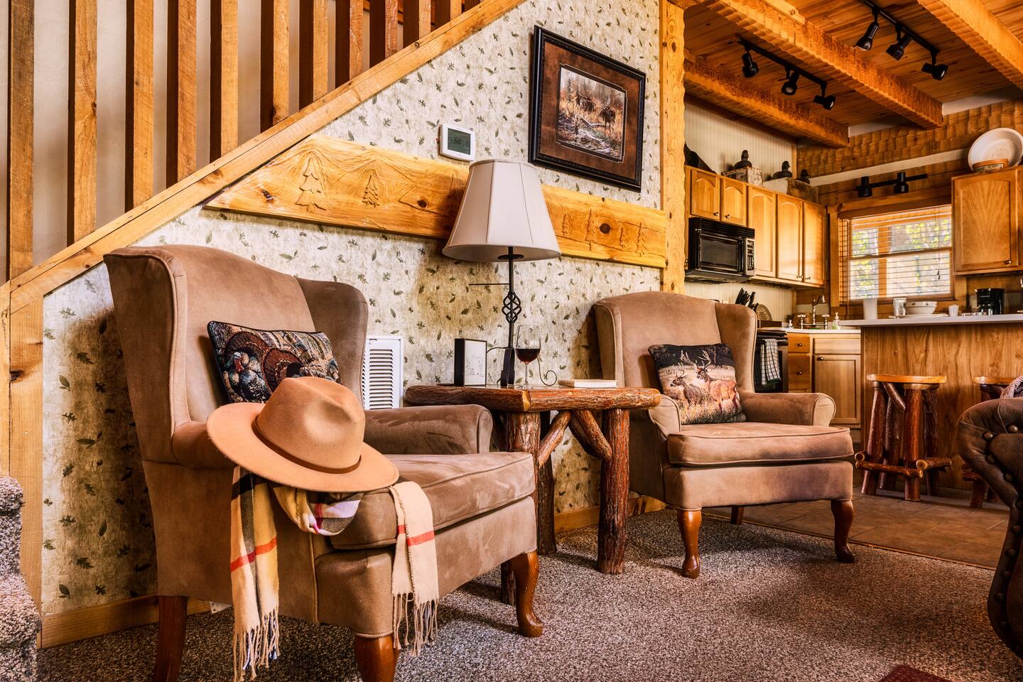 The main living area is open and includes living area with a gas fireplace, dining area and kitchen. The sofa is a queen-size sleeper with memory-foam mattress. The downstairs bedroom has a king-size bed, jacuzzi and bathroom with shower. The upstairs loft has a pool table and opens to an upper deck with rocking chairs. The upstairs bedroom has another king-size bed and en suite bathroom with washer and dryer. The hot-tub is on a lower deck over-looking the creek. This cabin also features a screened porch and sunroom.